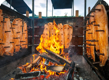 | Urige Forsthäuser & gemütliche Hütten bieten Kunsthandwerk und Spezialitäten aus Finnland | Eine der bekanntesten finnischen Spezialitäten ist der am offenen Feuer gegrillte Flammlachs, den Sie hier genießen können | |